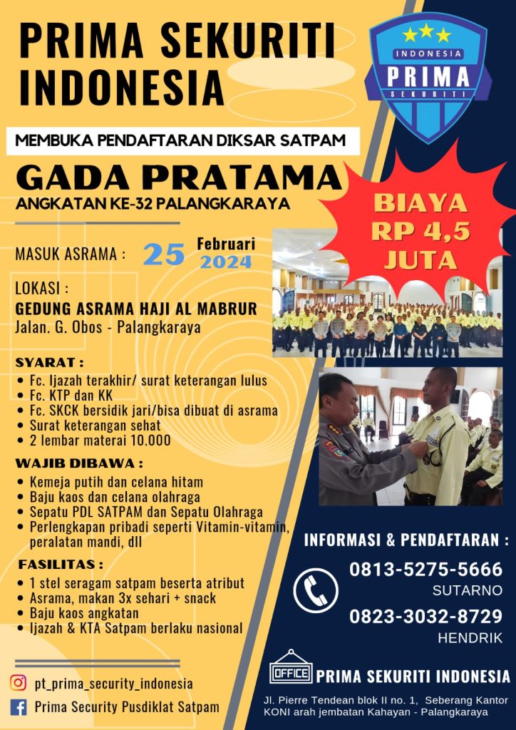Dibuka Kembali Pendaftaran Diklat Satpam Gada Pratama di Kota Palangka Raya untuk Tahun 2024