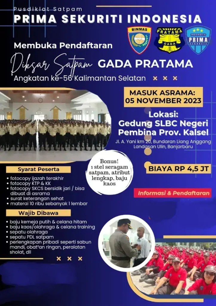 PRIMA SEKURITI INDONESIA DIKSAR SATPAM GADA PRATAMA Angkatan Ke-31 PALANGKARAYA MASUK ASRAMA 12 NOVEMBER 2023 Tempat: Gedung Asrama Haji Al-Mabrur Alamat: Jl. G. Obos-Palangkaraya SVARAT PESERTA Informasi & Pendaftaran